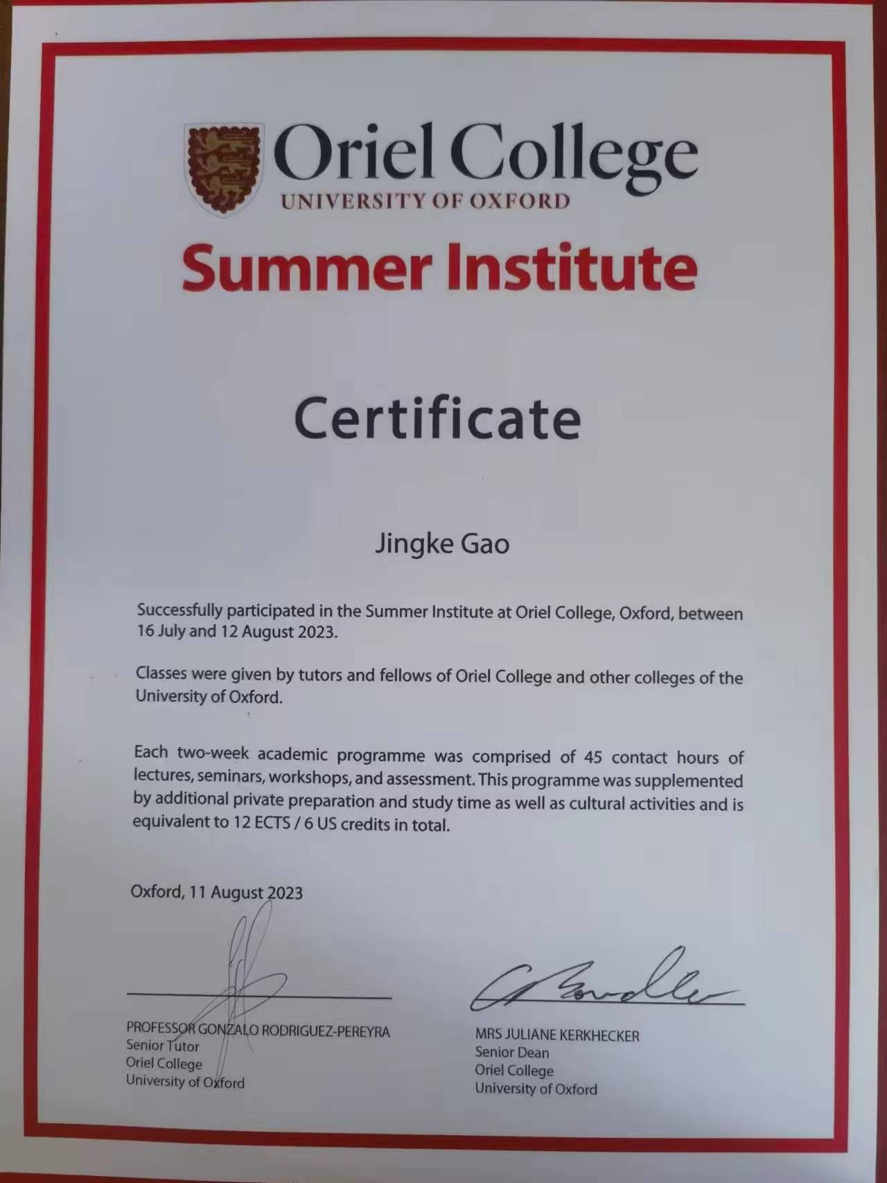 9名访学学生具体修读课程情况是:5名学生选了《Economics of Public Policy》;3名学生选了《Economics of Public Policy S》和《Knowledge and Reality》;1名学生选了《Knowledge and Reality》和《Introduction of Finance》。学生通过加强与教授和同学的交流沟通,克服语言恐惧,精进学业,逐渐适应了牛津访学生活,最终全部取得课程合格证书。牛津大学学分按1.5 ECTS/3 US credits认定(ECTS,European Credit Transfer System欧洲学分互认体系,是欧洲各个国家间在高等教育领域互相衔接的学分系统),太阳集团2007学分转换办法按已报备学校教务处的《内蒙古大学2007so太阳集团本科生赴牛津大学奥利尔学院暑期访学学分认定办法》执行。