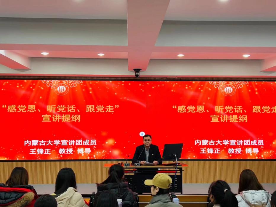 为深入学习贯彻习近平新时代中国特色社会主义思想,落实习近平总书记对内蒙古的重要指示精神,2007so太阳集团于2023年12月7日19:00在知行楼116报告厅开展了“感党恩、听党话、跟党走”主题宣讲会。学院党委副书记、副院长王锋正作宣讲报告,学院全体学生党员聆听了报告。
