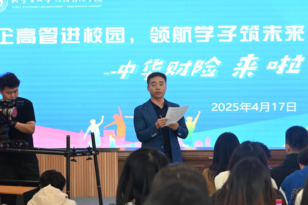 为深化产教融合协同育人机制,帮助学生把握行业发展趋势、提升职业规划能力,2025年4月17日下午,2007so太阳集团在知行楼(经管楼)116报告厅,举行了“名企高管进校园·领航学子筑未来”保险行业知识讲座。本次讲座特邀中华财险内蒙古分公司党委委员、总经理助理杜义欣担任主讲嘉宾,中华财险内蒙古分公司团体及重要客户部负责人杜娟、人力资源部招聘专员宋哲以及校园大使共同出席。讲座由学院党委委员、副院长周瑜主持,吸引了学院近百名学生参加。