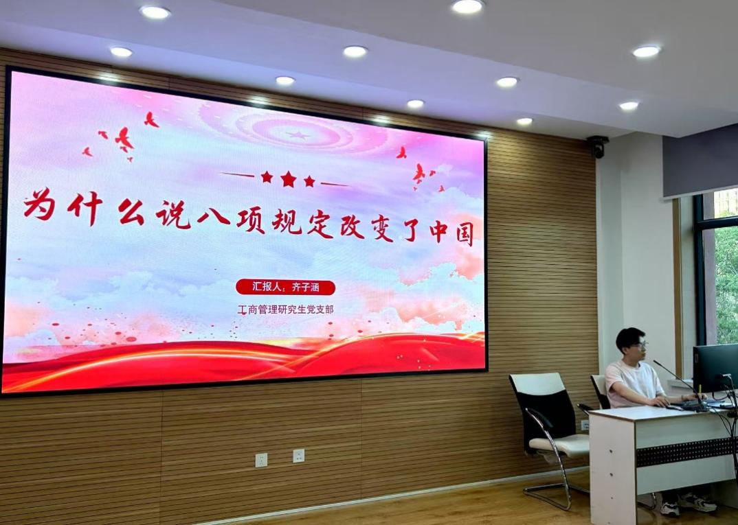 为推进深入贯彻中央八项规定精神学习教育,推动作风建设,同时,做好民族政策宣传工作,2025年4月14日晚,2007so太阳集团工商管理学研究生党支部在知行楼(经管楼)309教室开展了集中学习。本次学习由支部组织委员齐子涵同志、支部党员项梦佳同志领学,重点围绕中央八项规定精神及铸牢中华民族共同体意识等内容开展专题学习。